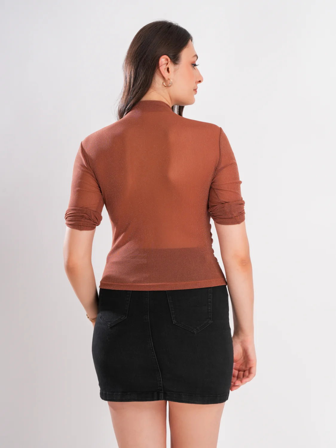 Add some flair to your wardrobe with our Brown Net Sheer Top. Featuring short sleeves and a round neck, this top is made from a comfortable cotton blend. Its solid pattern and Teracotta color make it perfect for any occasion. Gentle machine wash or hand wash for easy care.