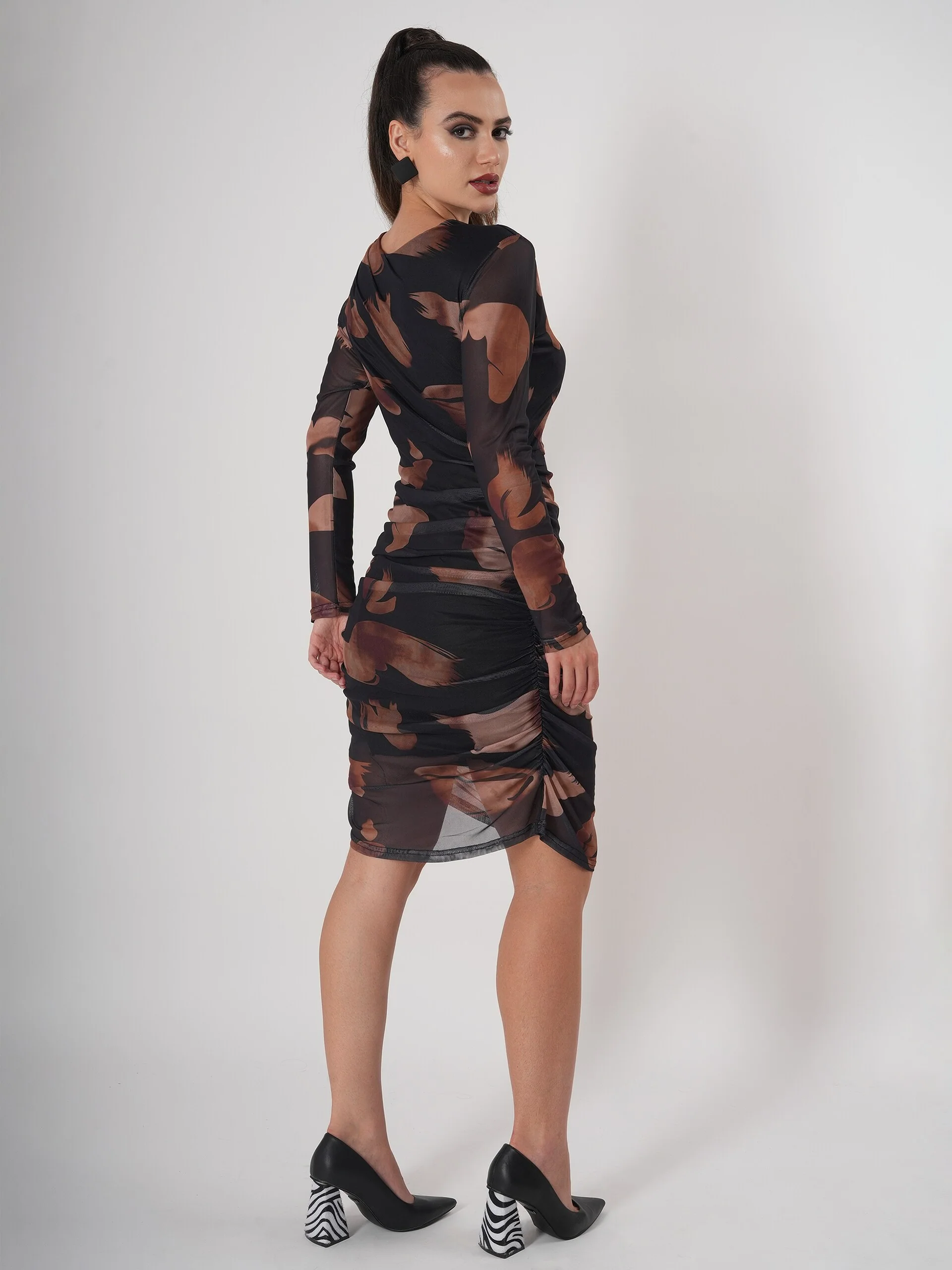 Clobug Marble Print Brown Midi Dress with Full Sleeve